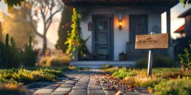For sale sign board outside house background, House for sale concept - Ai Generated