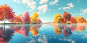 Colorful trees reflections in calm pond water on a beautiful autumn day background - Ai Generated