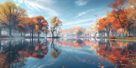 Colorful trees reflections in calm pond water on a beautiful autumn day background - Ai Generated