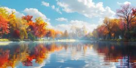 Colorful trees reflections in calm pond water on a beautiful autumn day background - Ai Generated