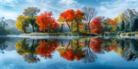 Colorful trees reflections in calm pond water on a beautiful autumn day background - Ai Generated