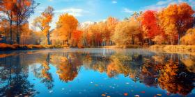 Colorful trees reflections in calm pond water on a beautiful autumn day background - Ai Generated