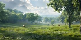 Countryside landscape farm field and grass with grazing cows background - Ai Generated