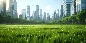 Green lawn with city skyscrapers background - Ai Generated