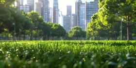 Green lawn with city skyscrapers background - Ai Generated