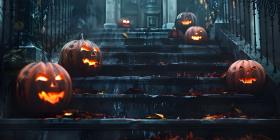 Halloween pumpkins outside a house Scary night background - Ai Generated
