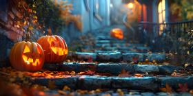Halloween pumpkins outside a house Scary night background - Ai Generated