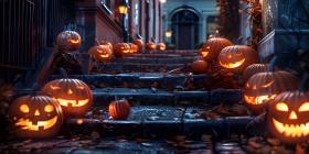 Halloween pumpkins outside a house Scary night background - Ai Generated