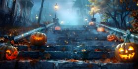 Halloween pumpkins outside a house Scary night background - Ai Generated