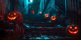 Halloween pumpkins outside a house Scary night background - Ai Generated