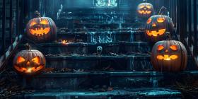 Halloween pumpkins outside a house Scary night background - Ai Generated