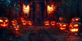 Halloween pumpkins outside a house Scary night background - Ai Generated
