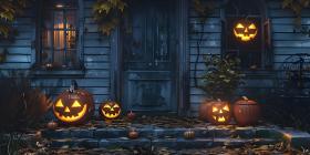 Halloween pumpkins outside a house Scary night background - Ai Generated
