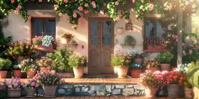 House decorated with with blooming flower pots in a sunny day background - Ai Generated