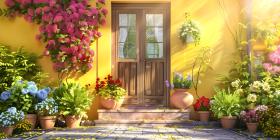 House decorated with with blooming flower pots in a sunny day background - Ai Generated