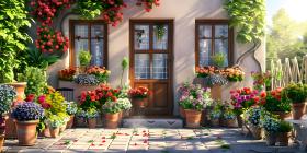 House decorated with with blooming flower pots in a sunny day background - Ai Generated