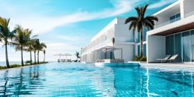 Luxury modern white beach hotel with swimming pool background - Ai Generated