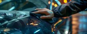 Man hand holding microfiber cloth polishing car background - Ai Generated