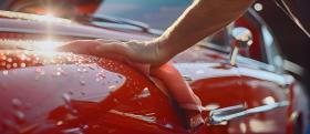 Man hand holding microfiber cloth polishing car background - Ai Generated