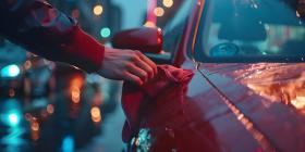 Man hand holding microfiber cloth polishing car background - Ai Generated