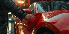 Man hand holding microfiber cloth polishing car background - Ai Generated