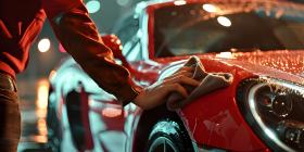 Man hand holding microfiber cloth polishing car background - Ai Generated