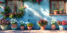 House decorated with with blooming flower pots in a sunny day background - Ai Generated