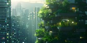 Innovative Green Architecture with Dense Plant Life on Skyscraper background - Ai Generated