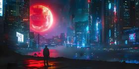 Neon city capital towers with futuristic technology background - Ai Generated