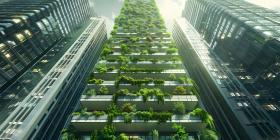 Innovative Green Architecture with Dense Plant Life on Skyscraper background - Ai Generated
