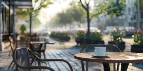 Outdoor empty coffee and restaurant with tables and chairs background - Ai Generated