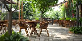 Outdoor empty coffee and restaurant with tables and chairs background - Ai Generated