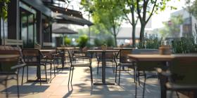 Outdoor empty coffee and restaurant with tables and chairs background - Ai Generated