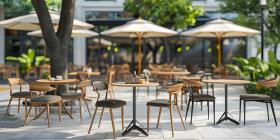 Outdoor empty coffee and restaurant with tables and chairs background - Ai Generated