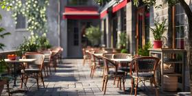Outdoor empty coffee and restaurant with tables and chairs background - Ai Generated