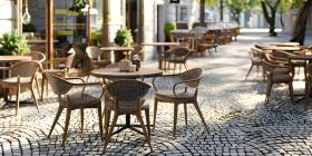 Outdoor empty coffee and restaurant with tables and chairs background - Ai Generated