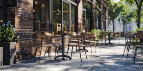 Outdoor empty coffee and restaurant with tables and chairs background - Ai Generated