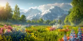 Mountain scenery with blooming meadows in springtime background - Ai Generated