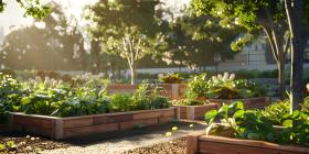Raised garden beds with plants in vegetable community garden background - Ai Generated