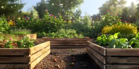 Raised garden beds with plants in vegetable community garden background - Ai Generated