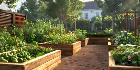 Raised garden beds with plants in vegetable community garden background - Ai Generated