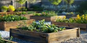 Raised garden beds with plants in vegetable community garden background - Ai Generated