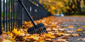 Rake, fence and colorful yellow maple leaves in fall on ground in autumn days background - Ai Generated