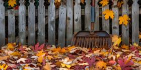 Rake, fence and colorful yellow maple leaves in fall on ground in autumn days background - Ai Generated