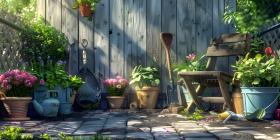 Set Of Tools For Gardener And Flowerpots In Sunny Garden background - Ai Generated