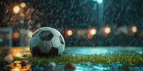Soccer ball rolling on the playing field on a rainy night background - Ai Generated