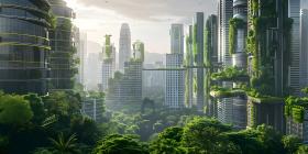 Innovative Green Architecture with Dense Plant Life on Skyscraper background - Ai Generated