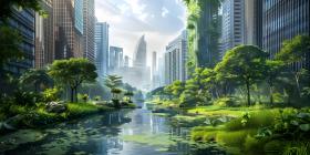 Innovative Green Architecture with Dense Plant Life on Skyscraper background - Ai Generated