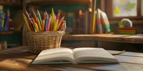 Study desk with a book open and a basket of colored pencils background - Ai Generated