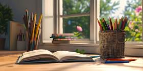 Study desk with a book open and a basket of colored pencils background - Ai Generated